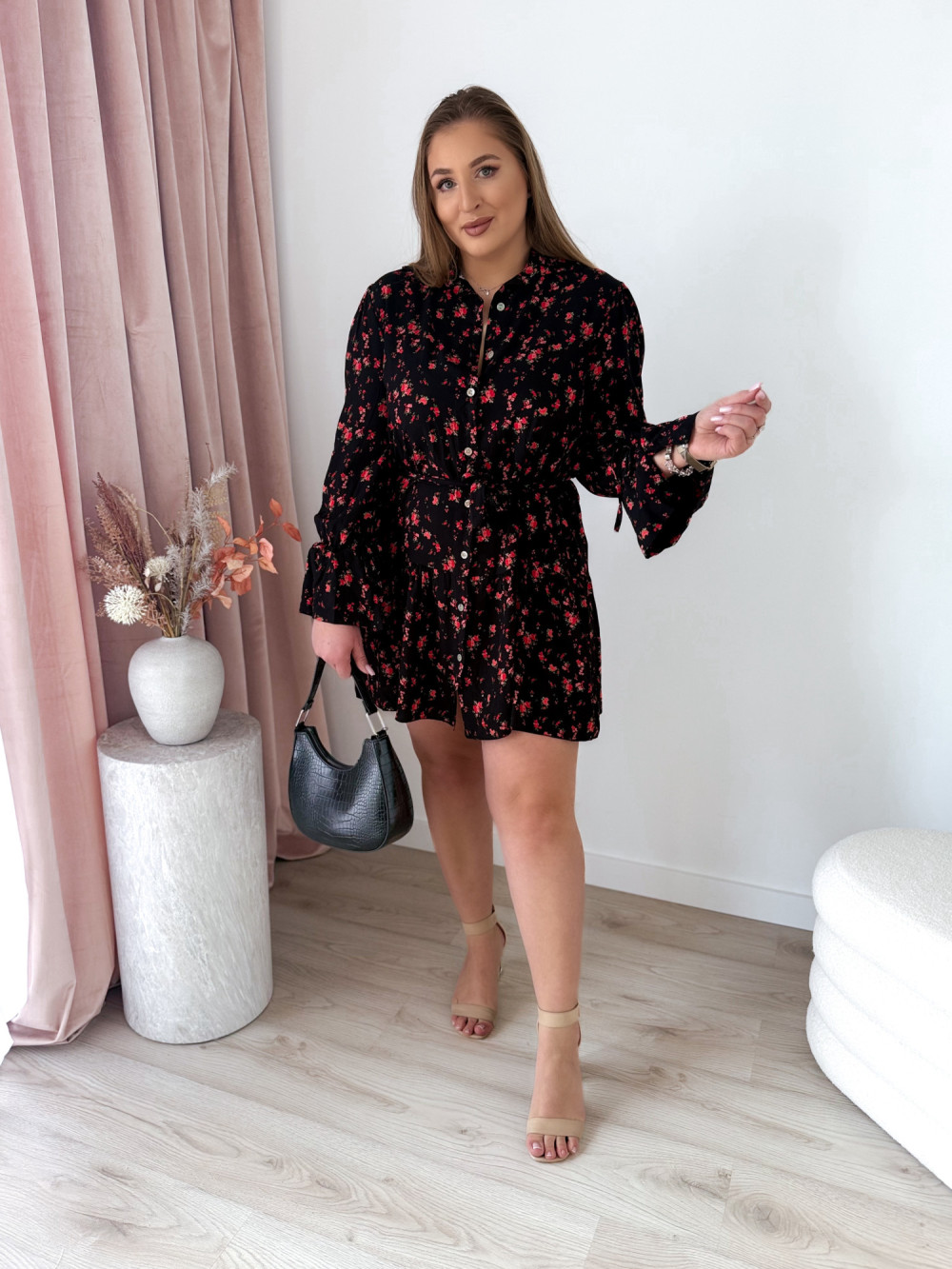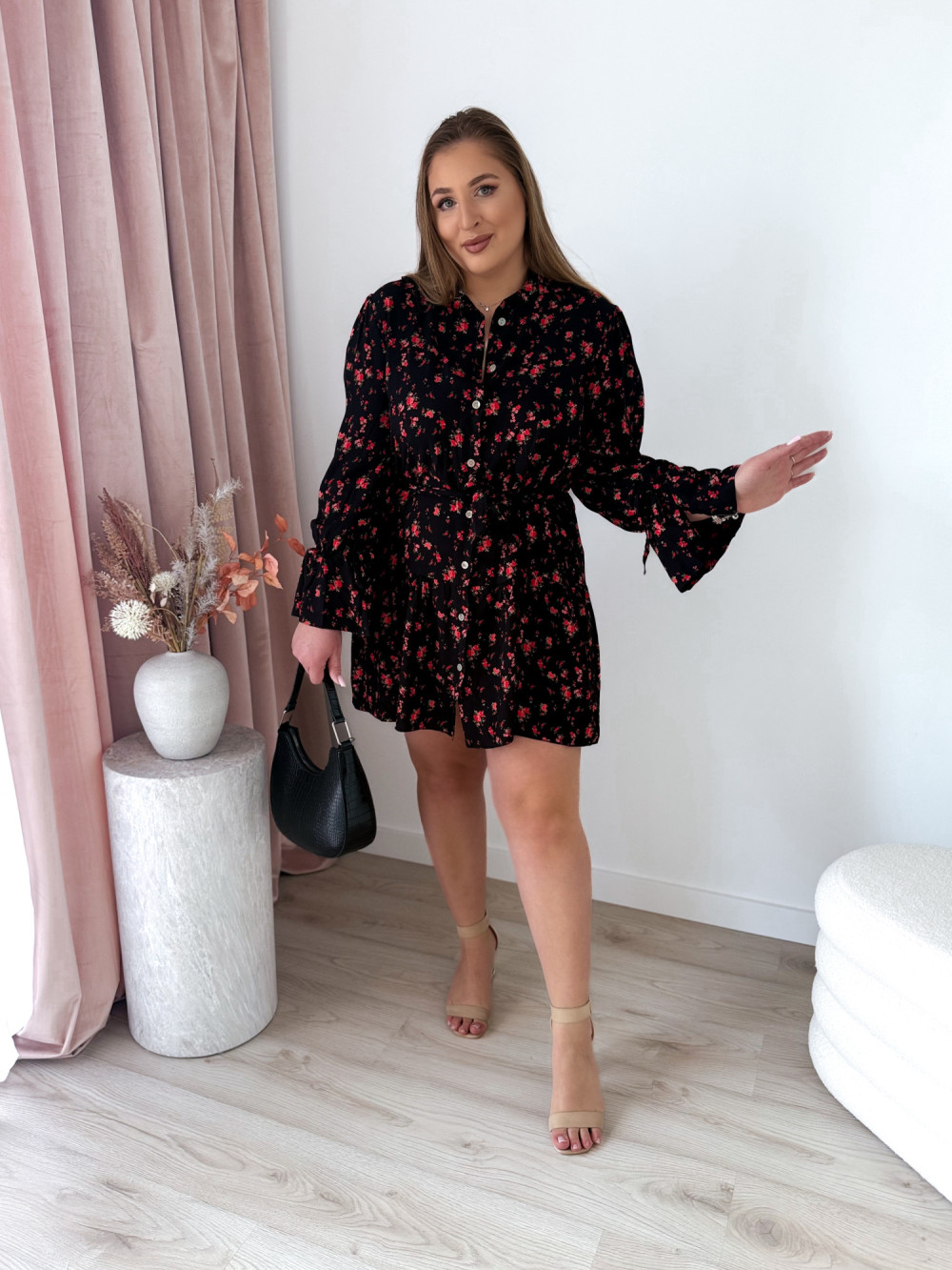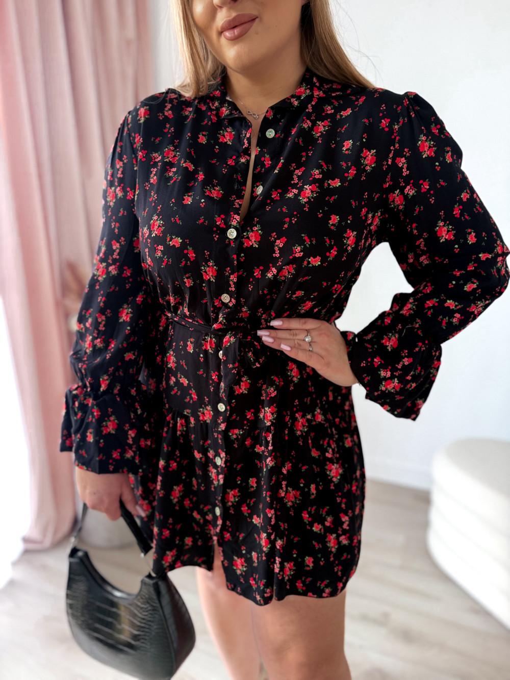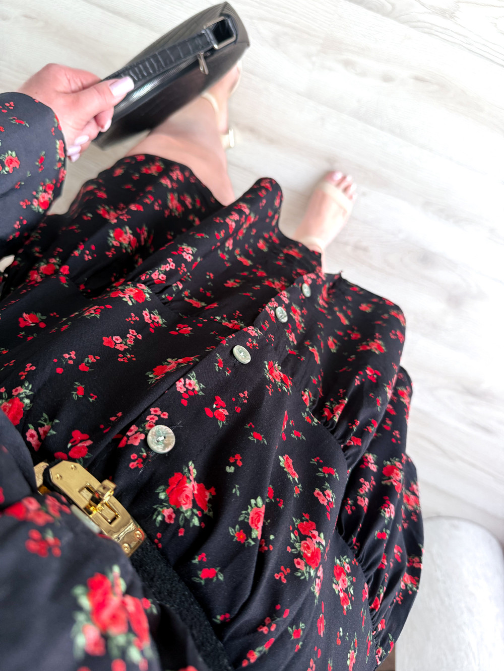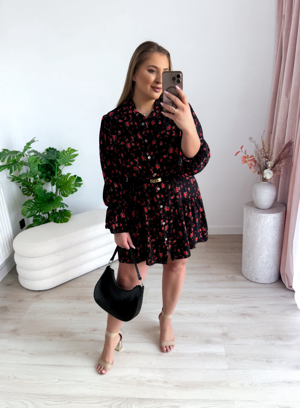 Sukienka z falbanką przy rękawie czarna w drobne kwiaty Emily
