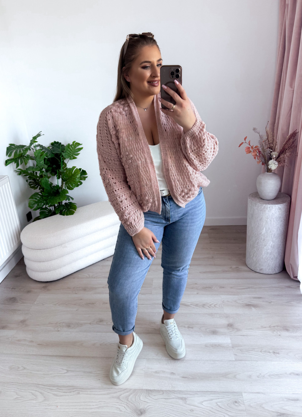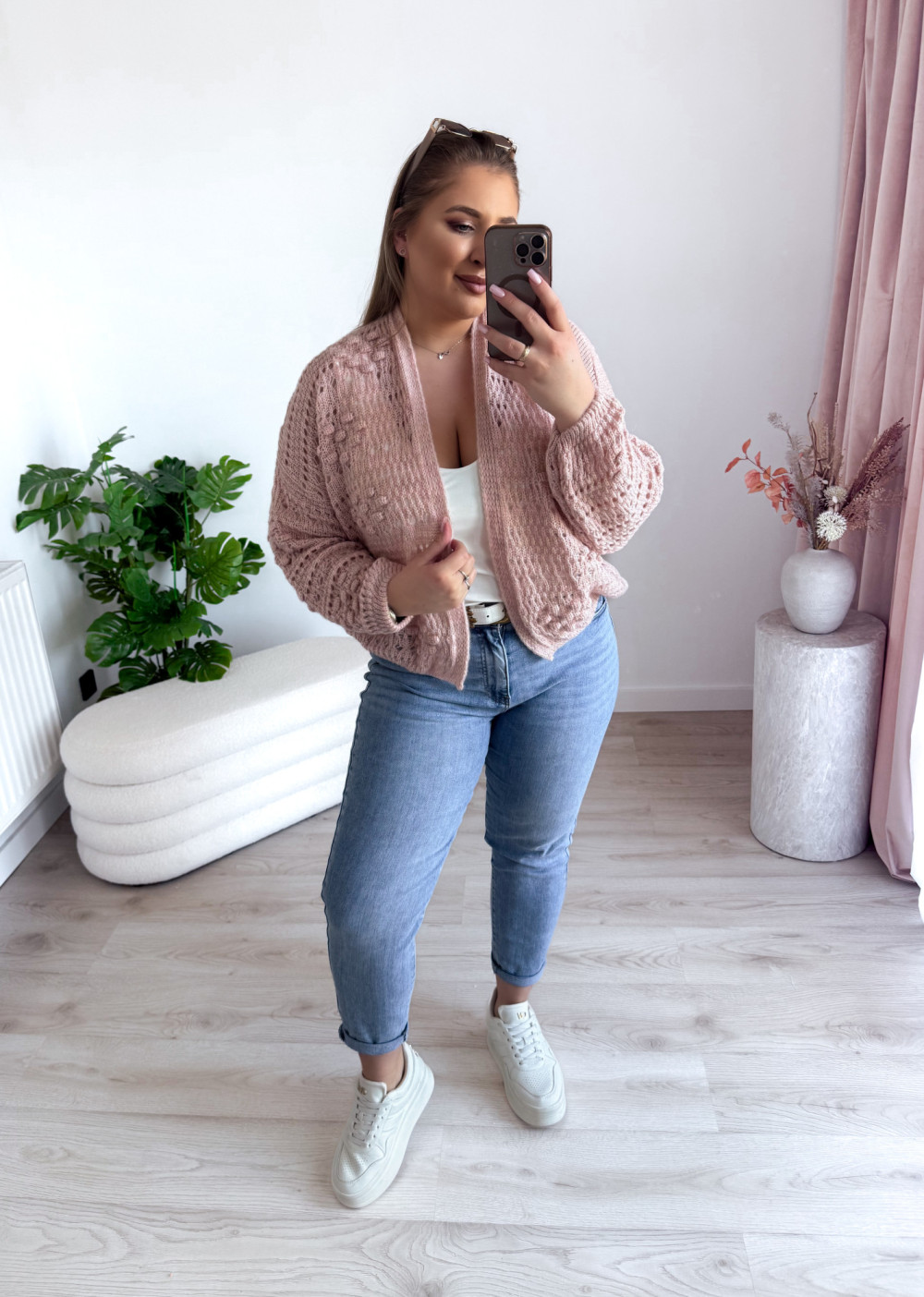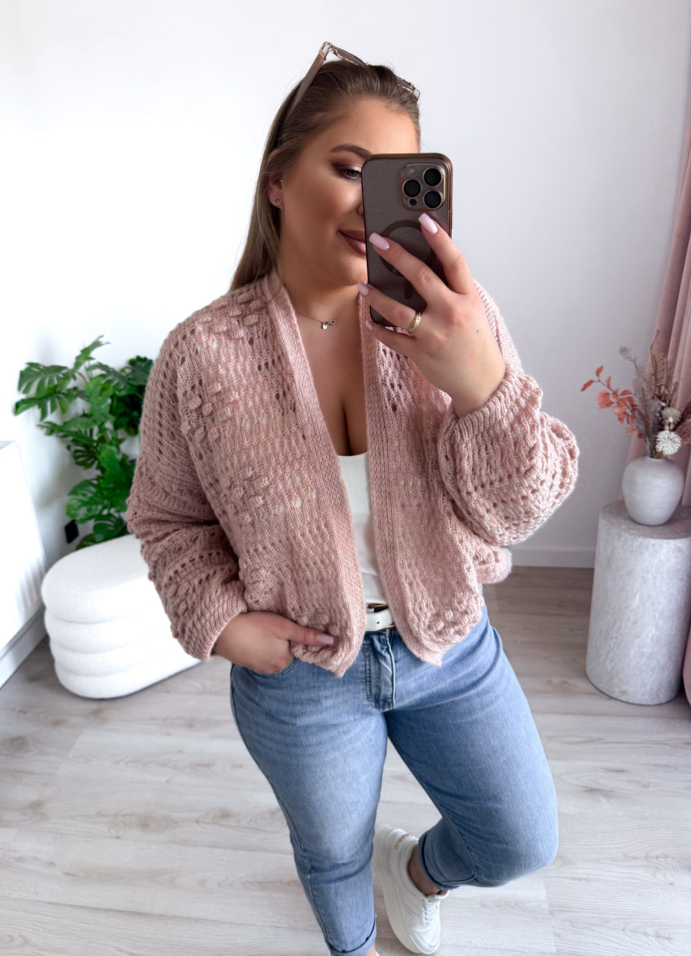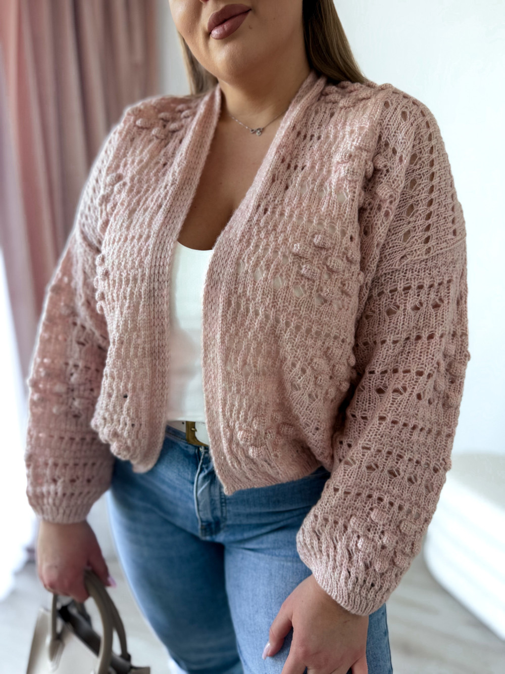 Lekki kardigan ażurowy o subtelnym, kobiecym charakterze, który doskonale uzupełni zarówno codzienne, jak i bardziej eleganckie stylizacje. Delikatny, ażurowy splot nadaje mu lekkości i finezji, a długie, delikatnie bufiaste rękawy podkreślają romantyczny styl i aktualne trendy. Idealny jako stylowa narzutka na chłodniejsze dni.