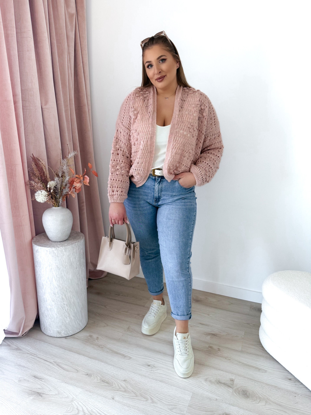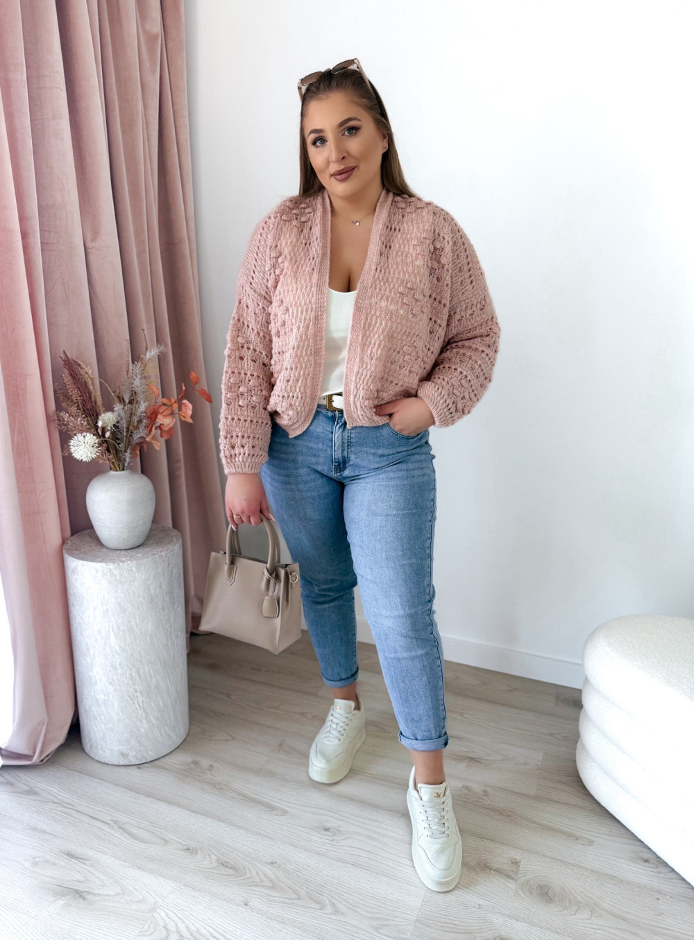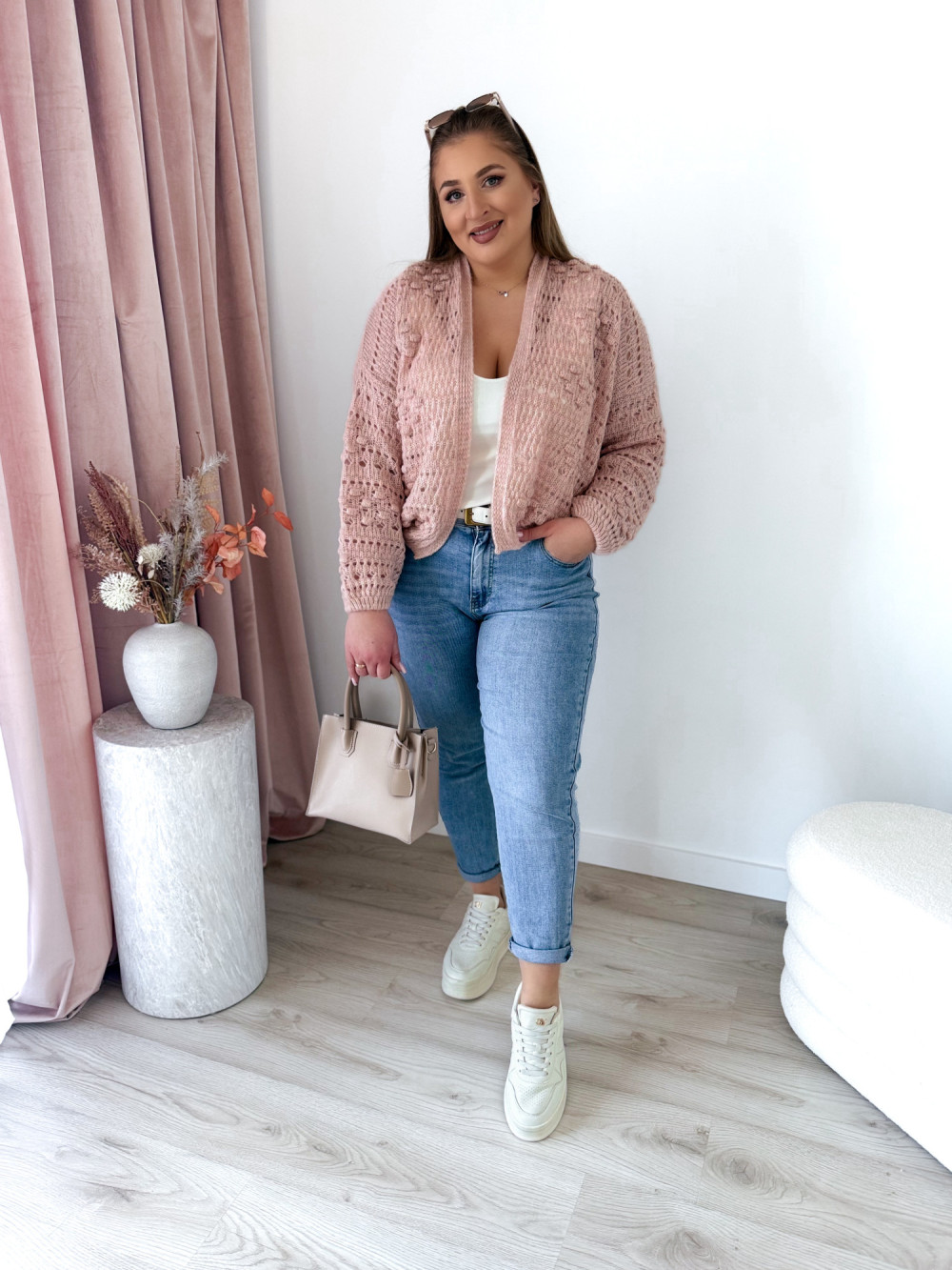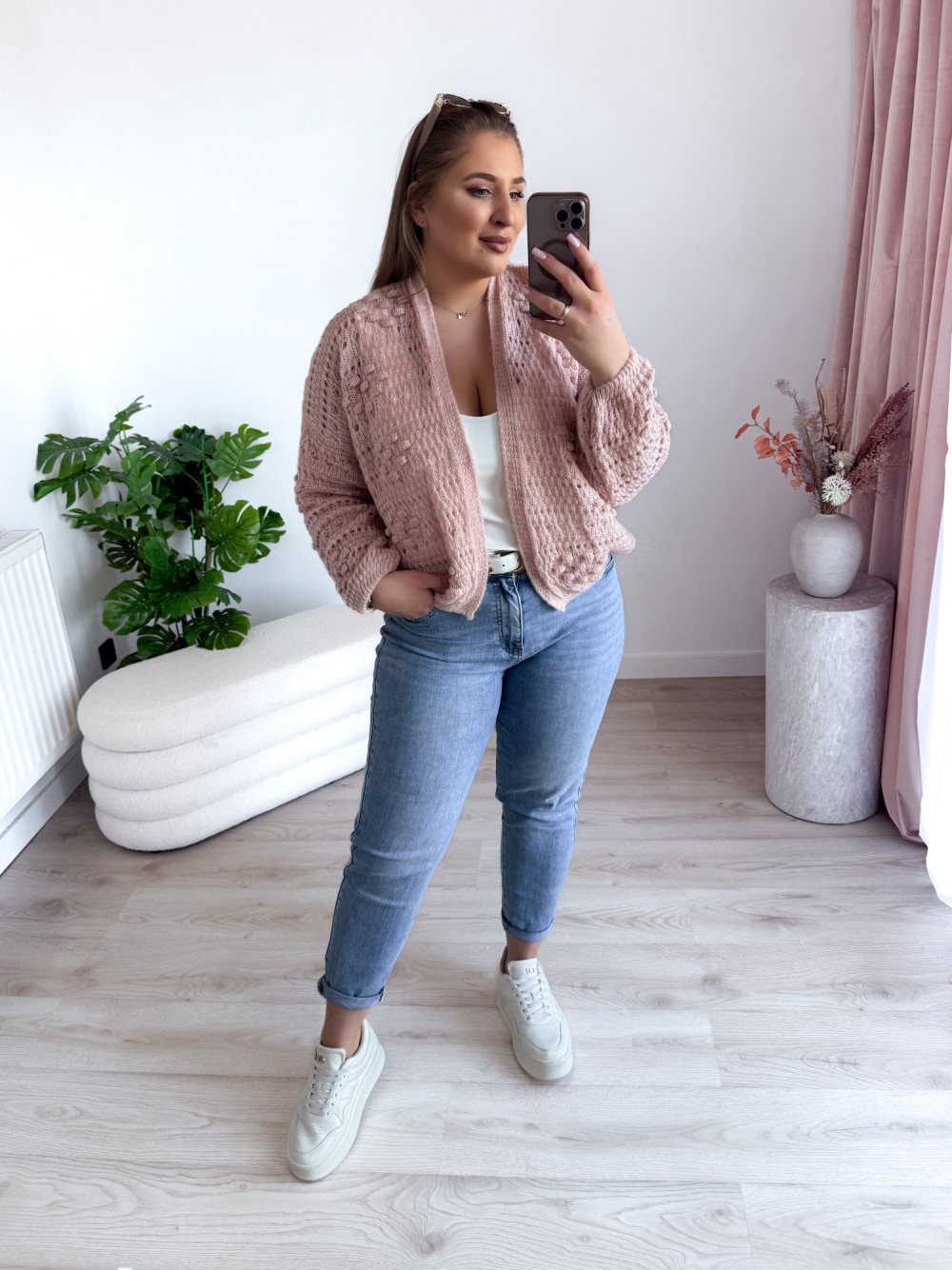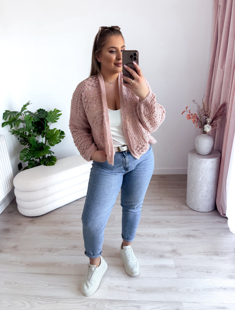 Lekki kardigan ażurowy o subtelnym, kobiecym charakterze, który doskonale uzupełni zarówno codzienne, jak i bardziej eleganckie stylizacje. Delikatny, ażurowy splot nadaje mu lekkości i finezji, a długie, delikatnie bufiaste rękawy podkreślają romantyczny styl i aktualne trendy. Idealny jako stylowa narzutka na chłodniejsze dni.