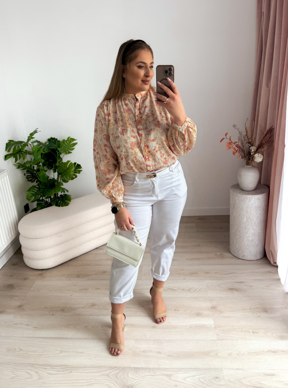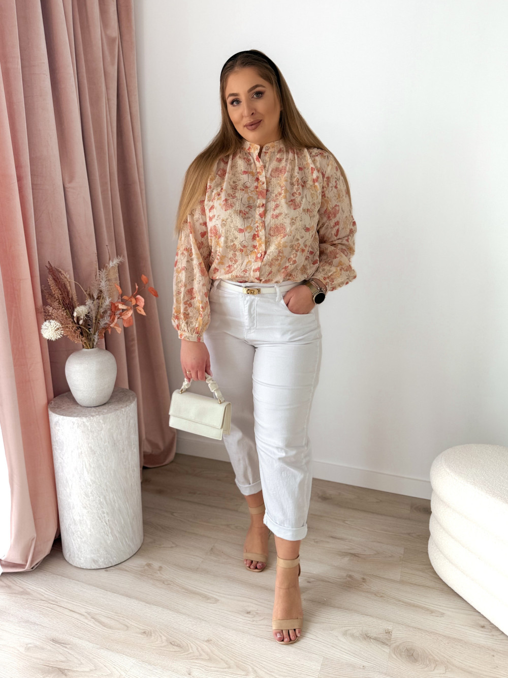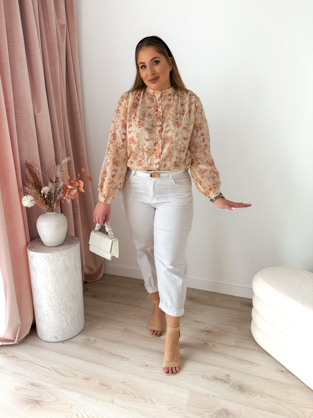 Kobieca koszula z długim rękawem w delikatny, kwiatowy wzór. Subtelna koronka nadaje jej eleganckiego i romantycznego charakteru, a klasyczne zapięcie na guziki zapewnia wygodę oraz ponadczasowy styl. Idealna zarówno do pracy, jak i na co dzień.