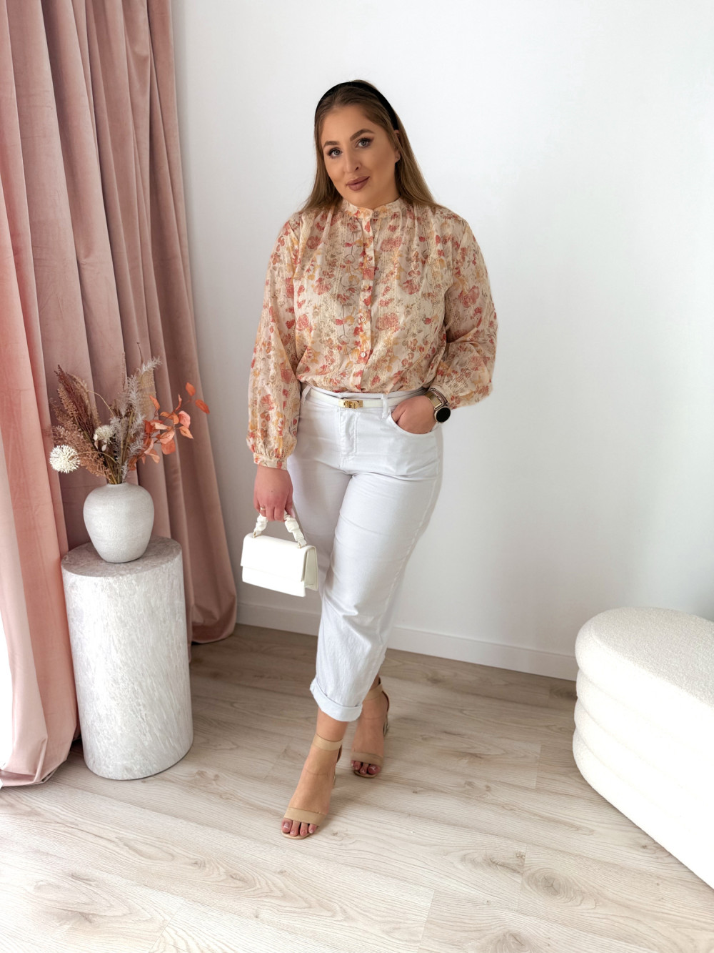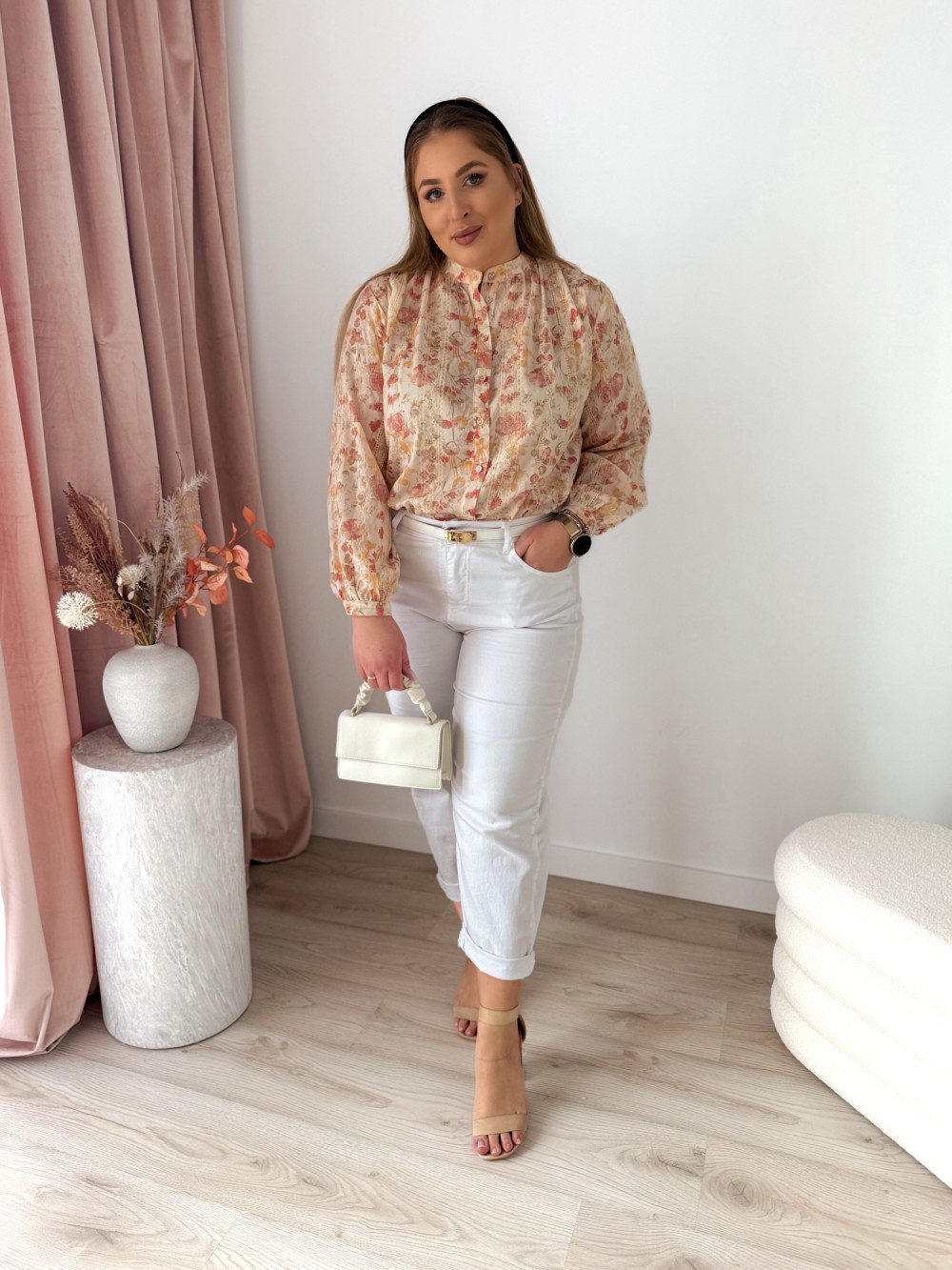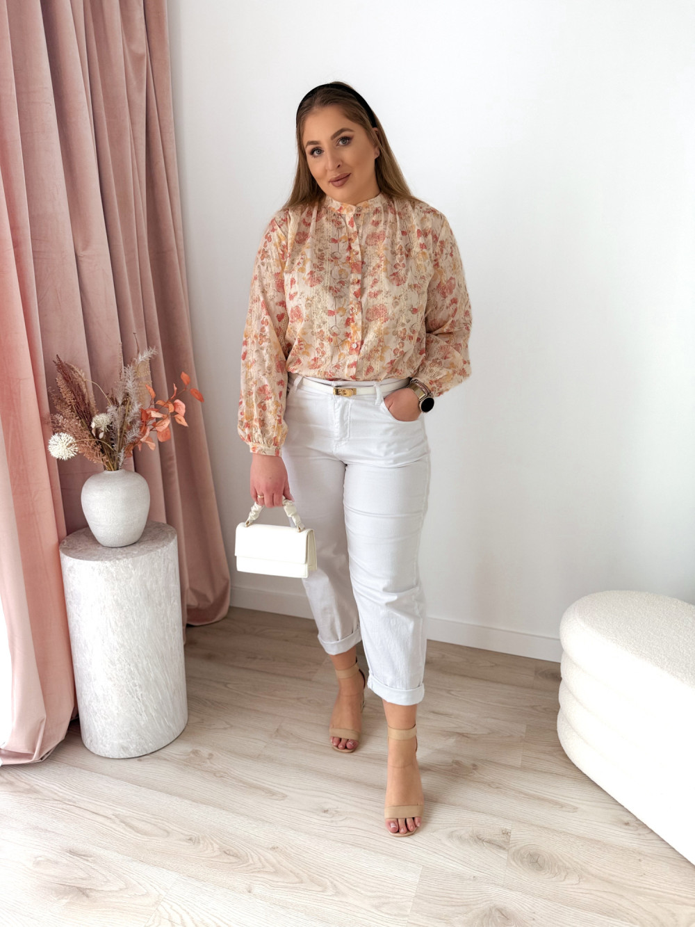 Kobieca koszula z długim rękawem w delikatny, kwiatowy wzór. Subtelna koronka nadaje jej eleganckiego i romantycznego charakteru, a klasyczne zapięcie na guziki zapewnia wygodę oraz ponadczasowy styl. Idealna zarówno do pracy, jak i na co dzień.
