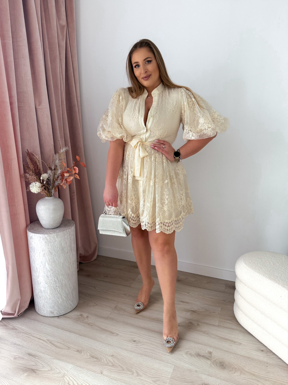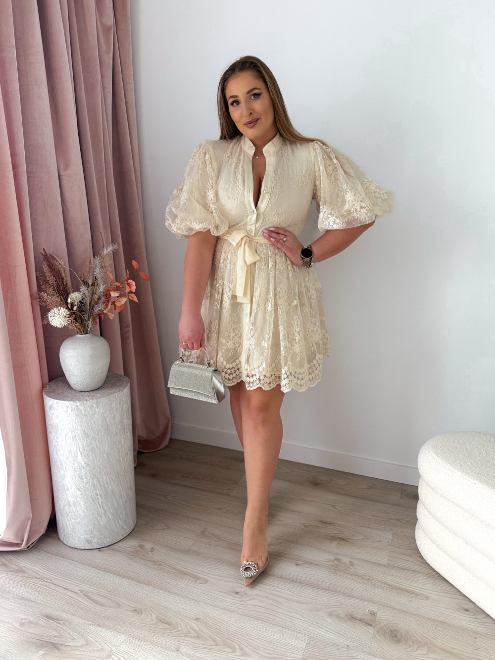 Krótka sukienka w stylu boho, zapinana na guziki, która łączy lekkość i kobiecy charakter. Bufiaste rękawy dodają romantycznego uroku, a pasek do wiązania pozwala podkreślić talię i dopasować fason do sylwetki. Idealna na ciepłe dni, wakacyjne wyjazdy i codzienne stylizacje.