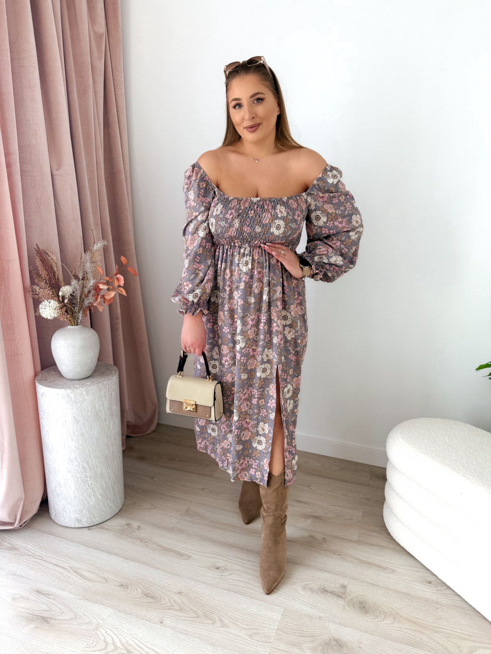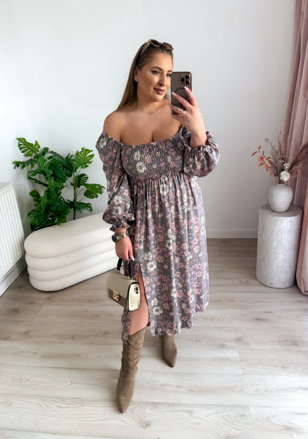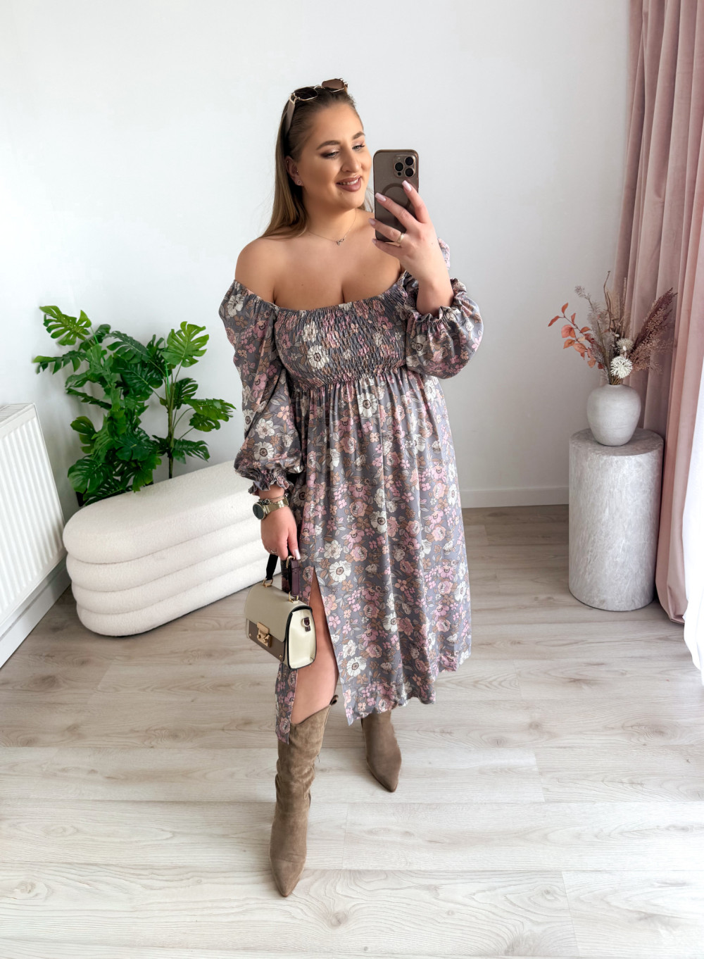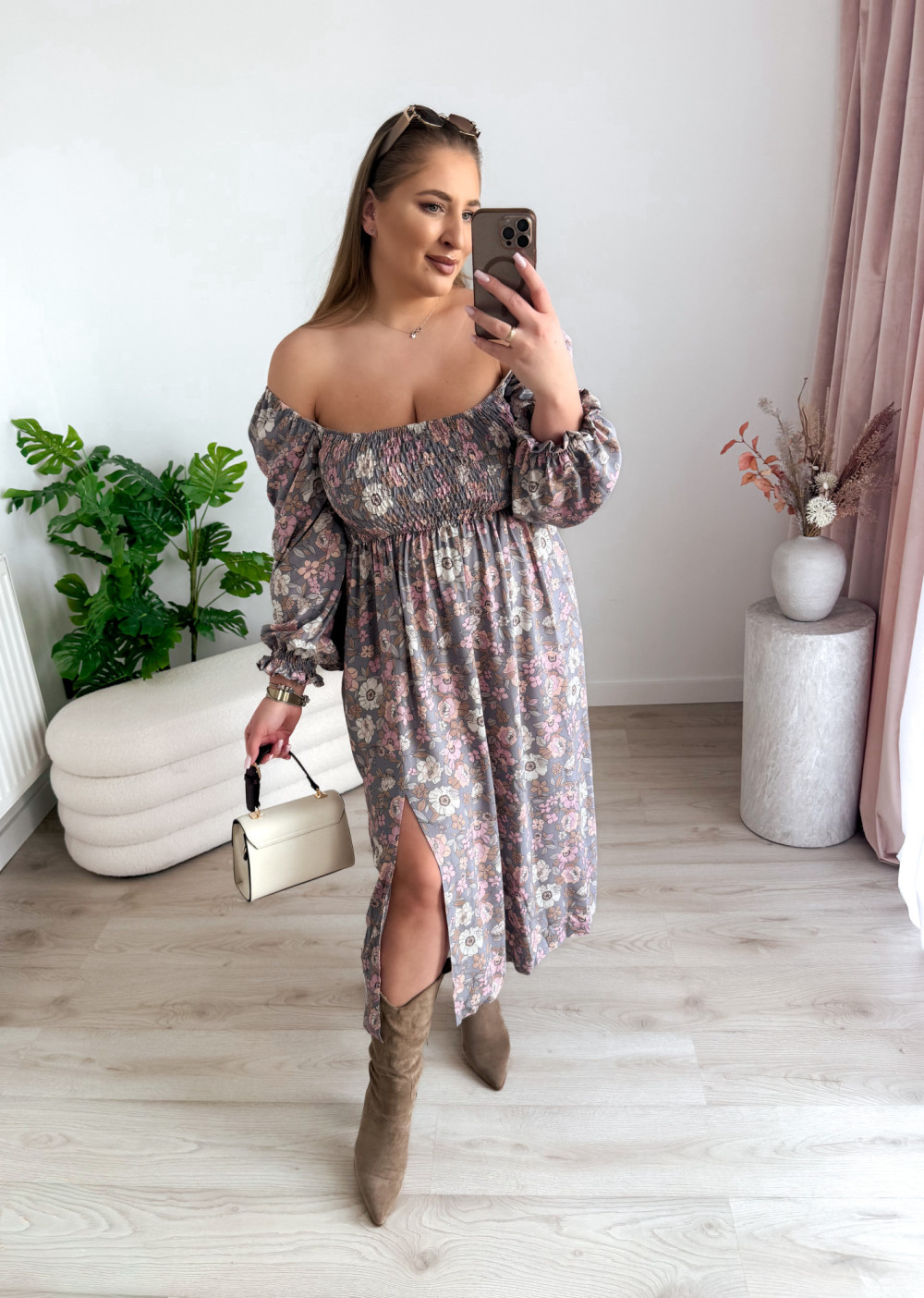 Sukienka midi grafitowa w pudrowe kwiaty Simply