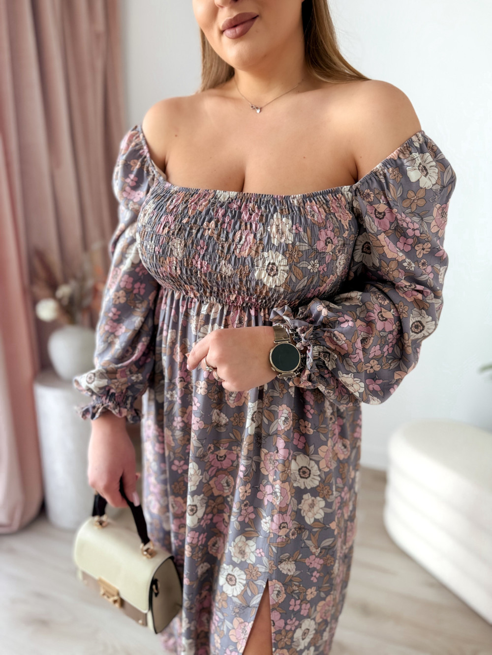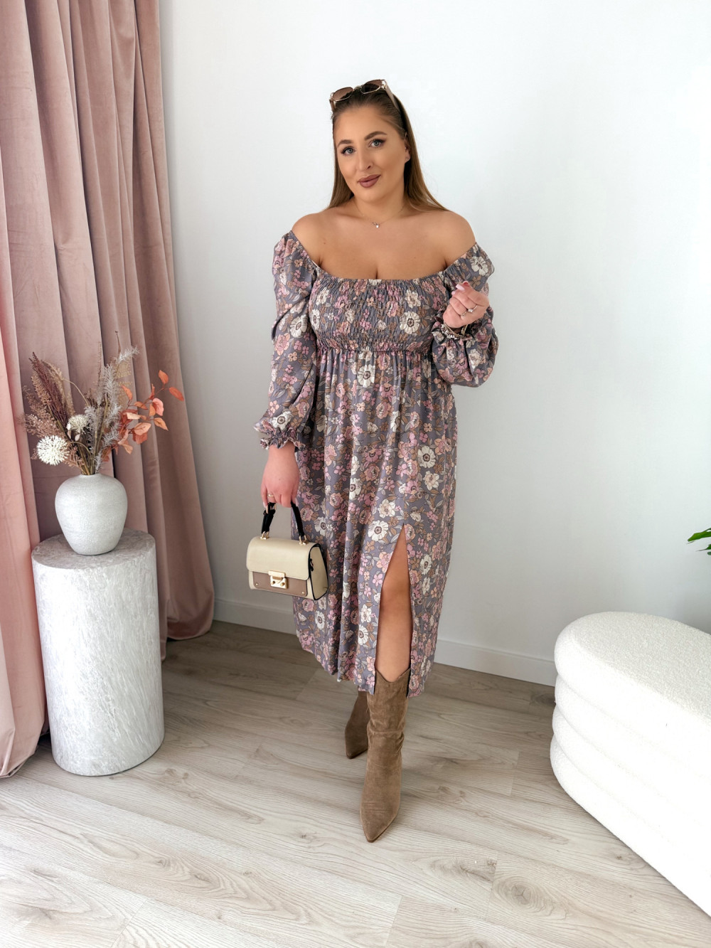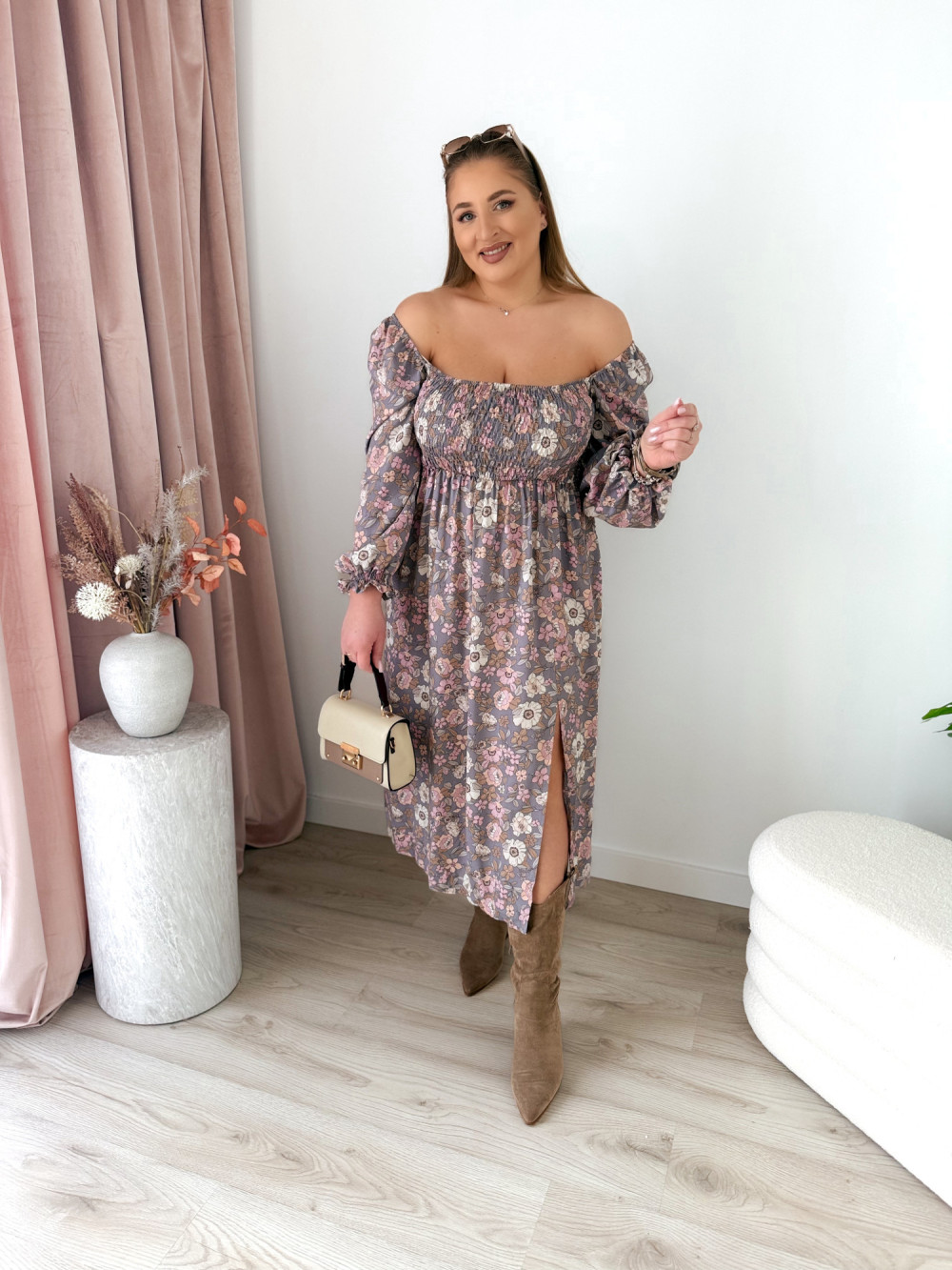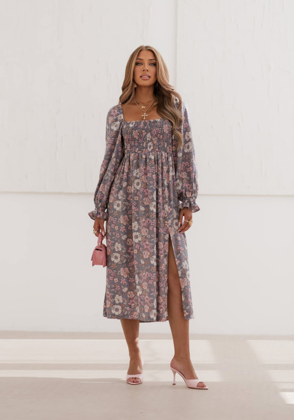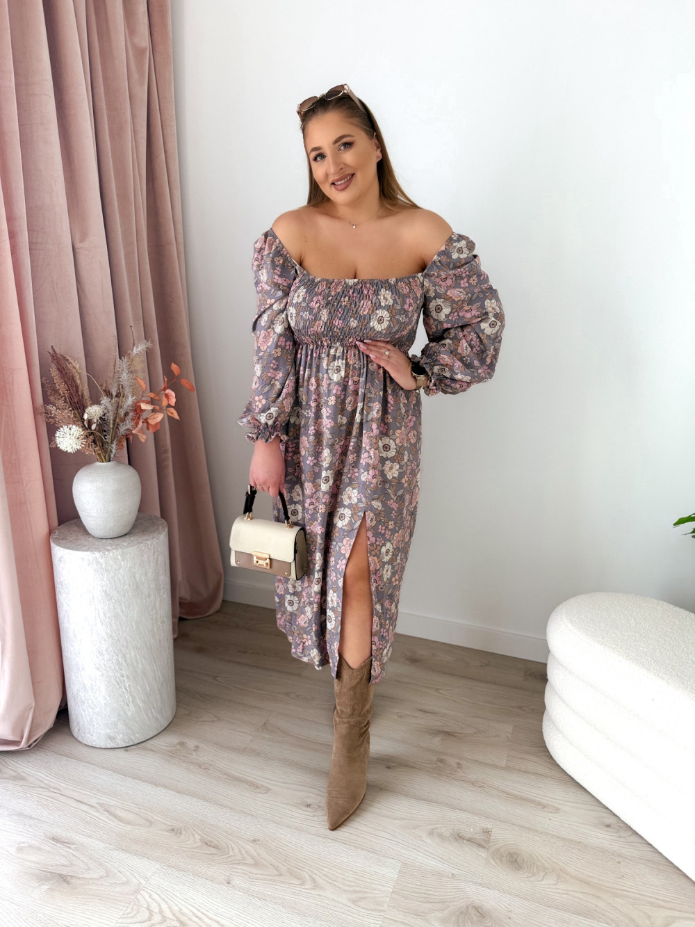 Sukienka midi grafitowa w pudrowe kwiaty Simply