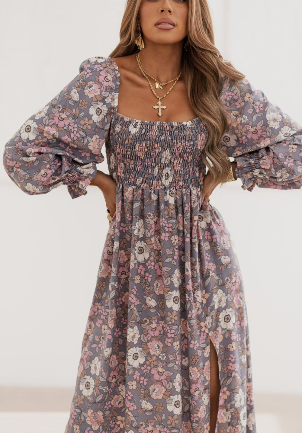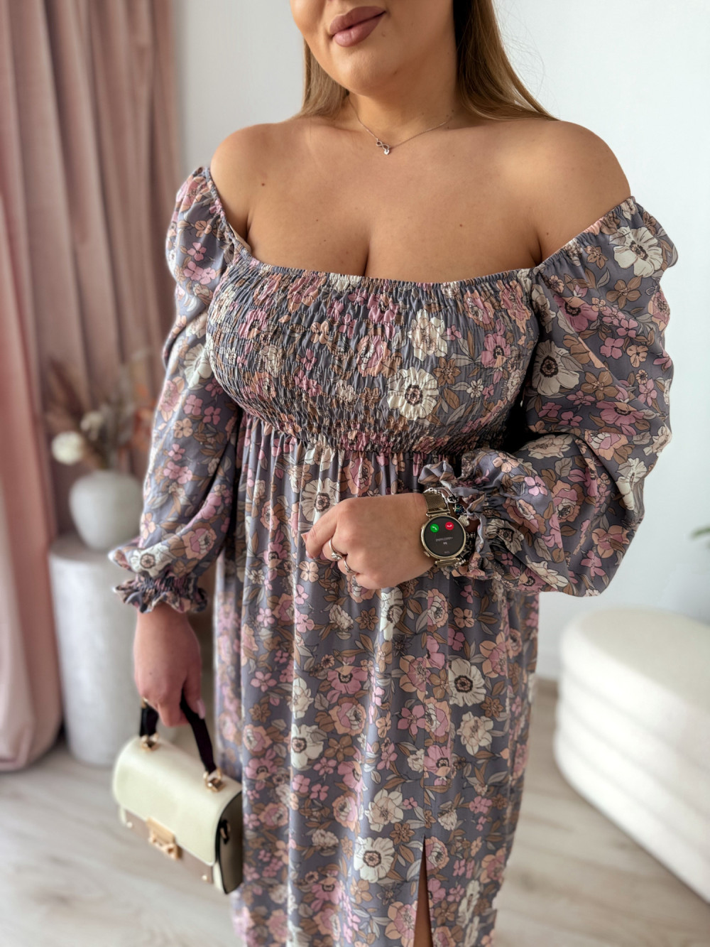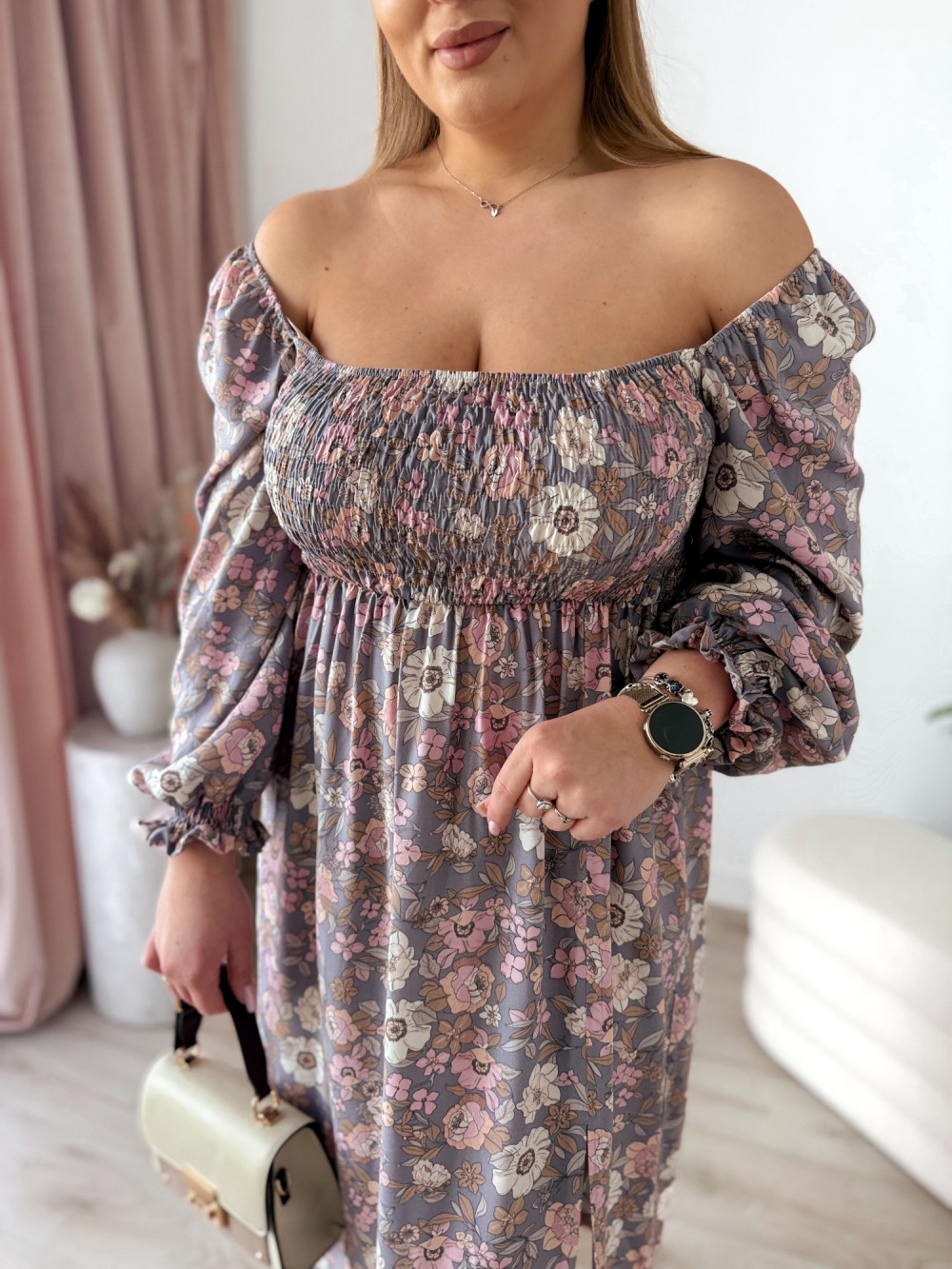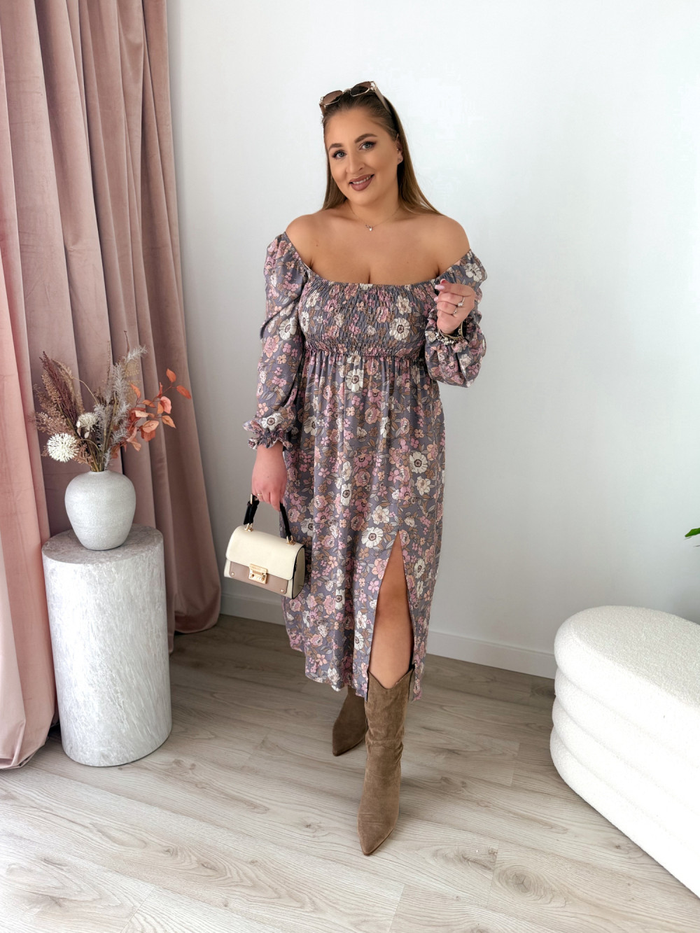 Sukienka midi grafitowa w pudrowe kwiaty Simply